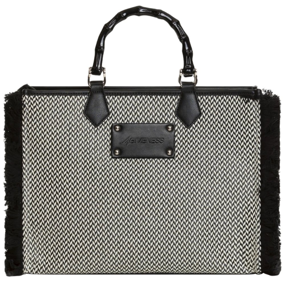 Borsa da mare di forma rettangolare, con un motivo a spina di pesce in bianco e nero.
