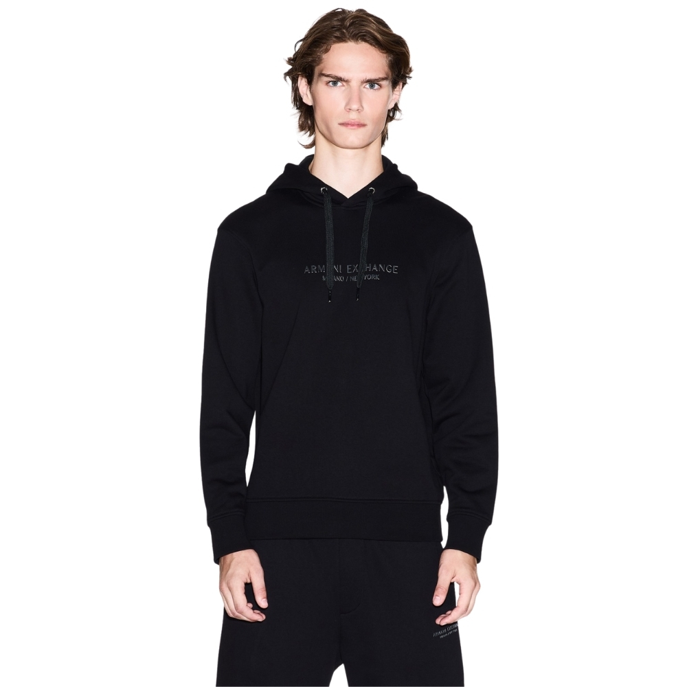 Dettaglio lettering Armani Exchange Milano / New York tono su tono sul petto