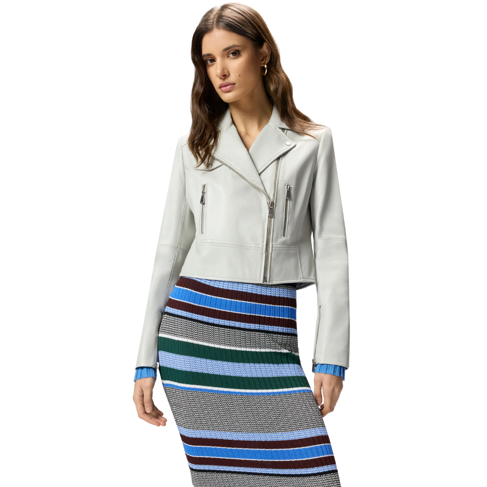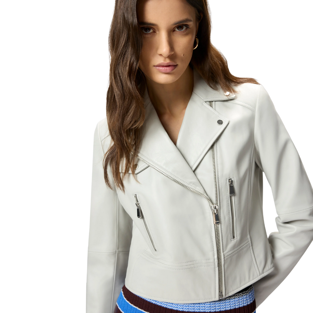 Giacca chiodo stile biker realizzata in morbida nappa e dotata di chiusura con zip decentrata. Il capo è caratterizzato da un ampio revers con bottoni, tasche verticali con zip sul davanti, un taschino sul petto con patta e bottone e comode aperture con zip ai polsi. Il design è rifinito dall’iconico logo Love Birds in rilievo sul retro.