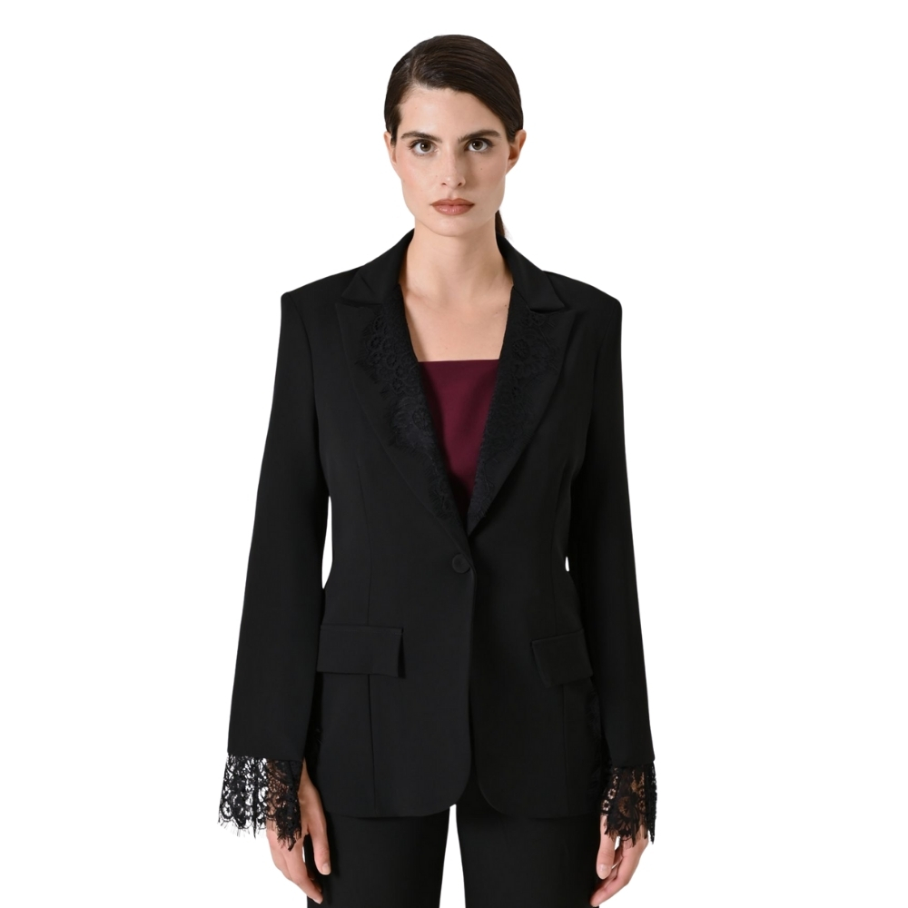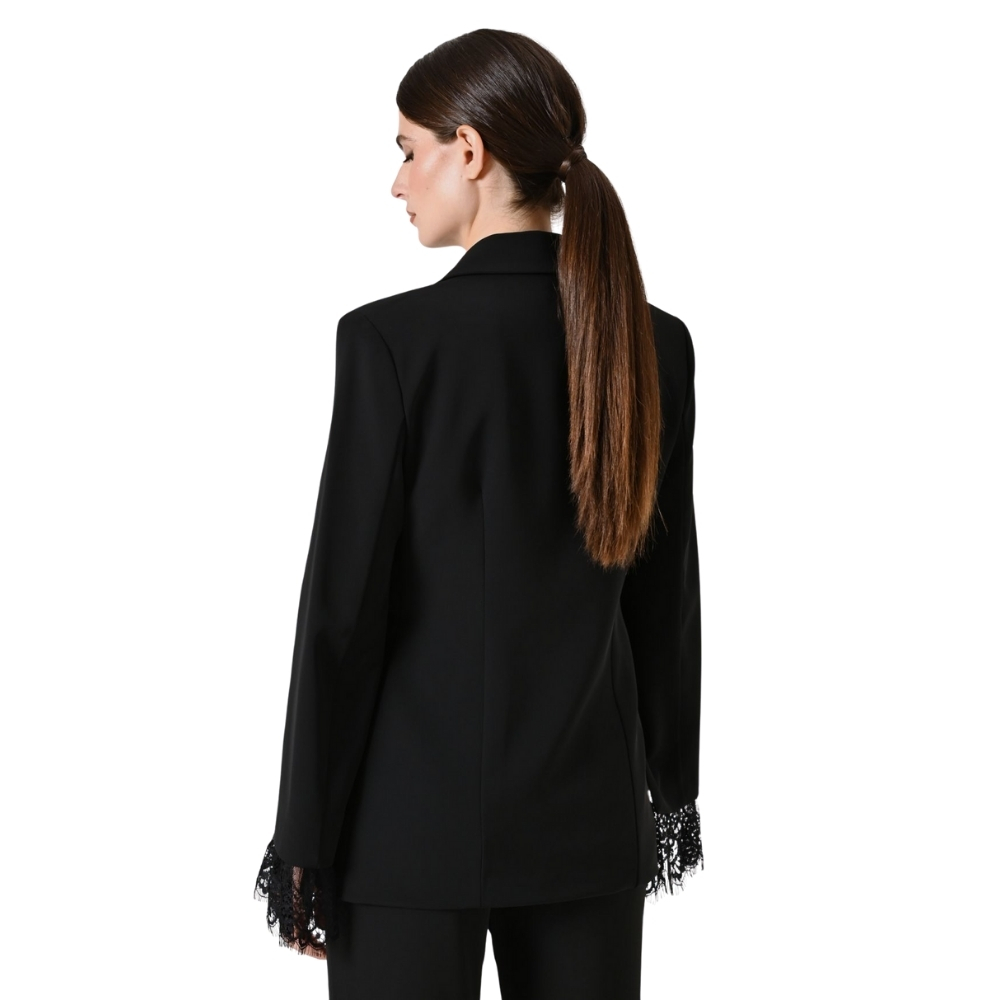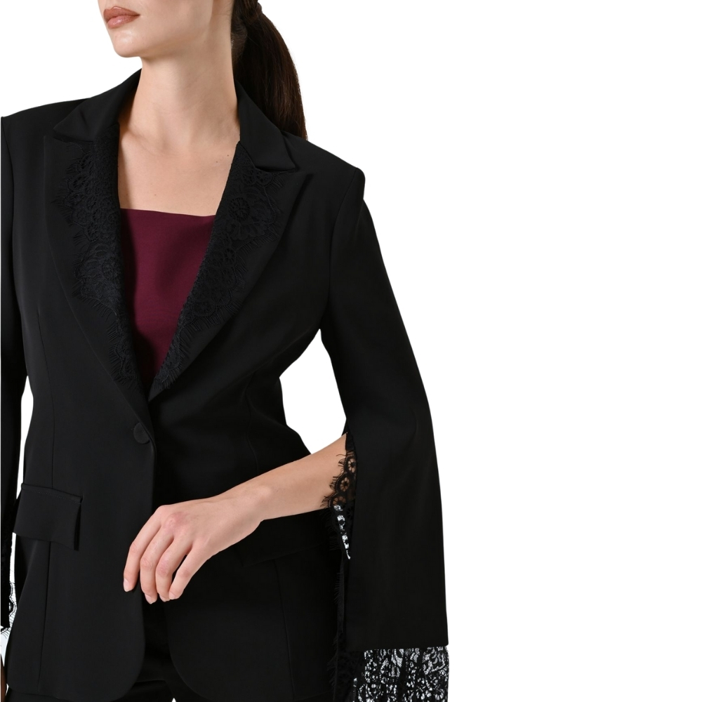 Realizzata in cadi con inserti in pizzo, la Giacca Nera con Inserti in Pizzo presenta spalline imbottite, fodera interna, revers doppiati in pizzo e maniche con spacco rifinito in pizzo. Il bottone rivestito tono su tono aggiunge un dettaglio ricercato alla chiusura frontale.