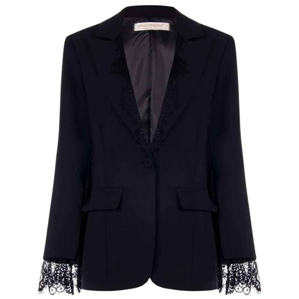 La Giacca Nera con Inserti in Pizzo è un capo raffinato e sofisticato, pensato per impreziosire ogni look da sera con un tocco di femminilità decisa.