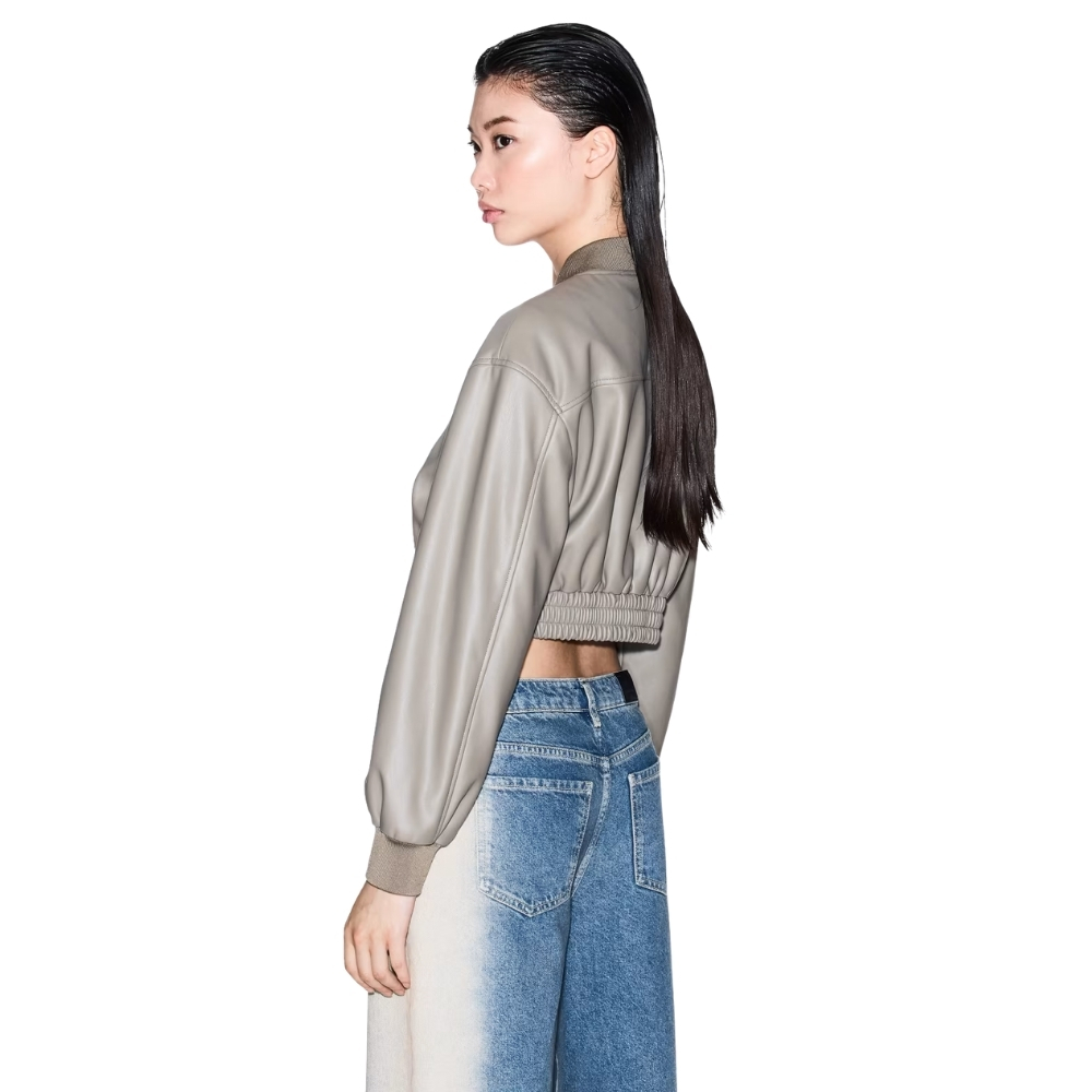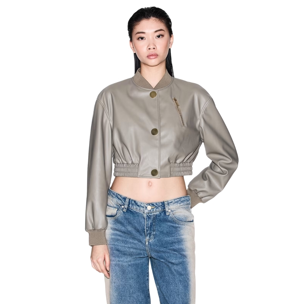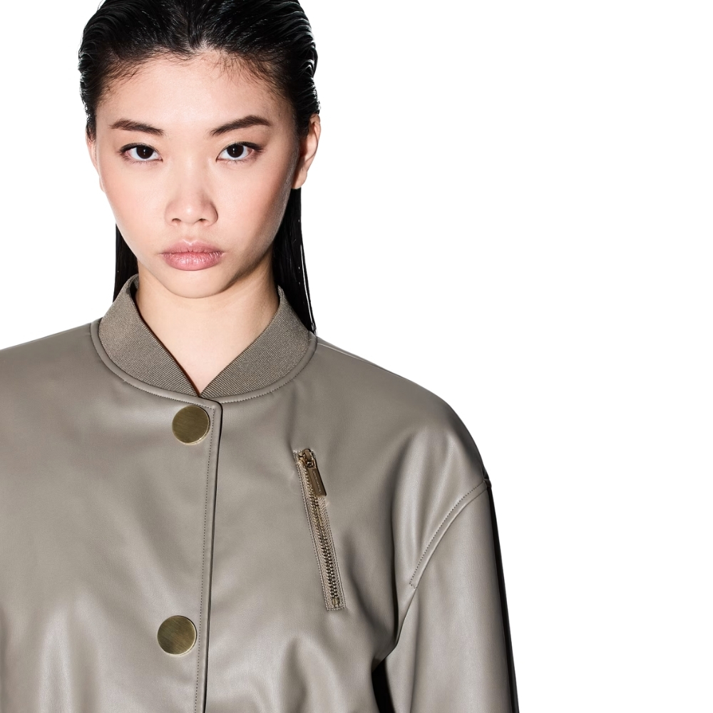 Giubbino Armani Exchange Blouson Faux Lth Short Jkt da donna in poliuretano, modello bomber cropped a manica lunga, interamente foderato, con colletto college e polsini in maglia, abbottonatura a tre grandi bottoni in metallo dorato mat, tasca a filo con zip sul petto e fondo elastico