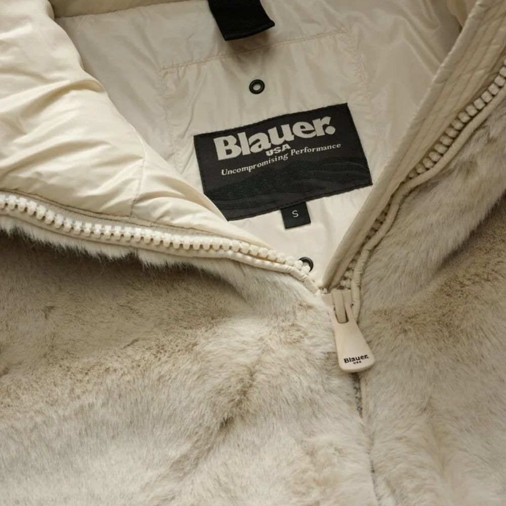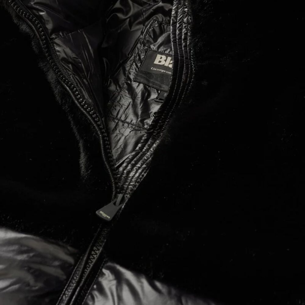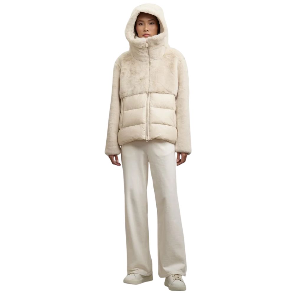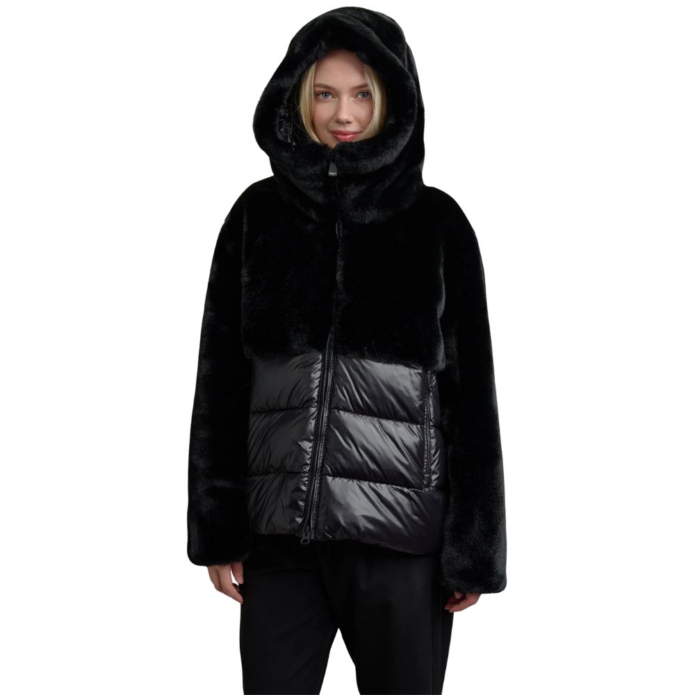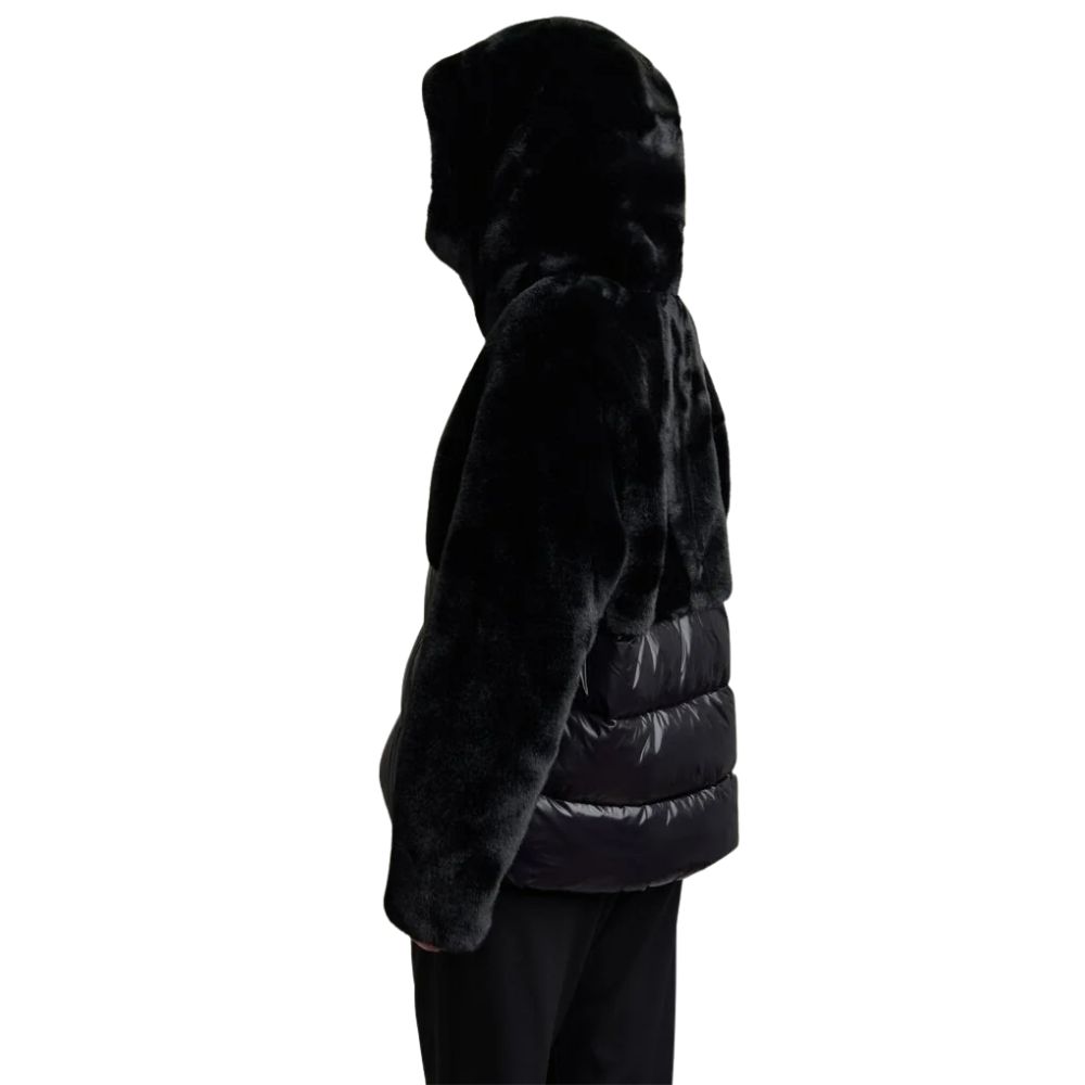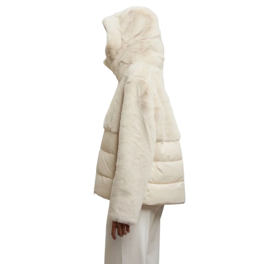 Giubbetto in ecopelliccia nella parte superiore e in nylon lucido nella parte inferiore. Caldo cappuccio ed impuntura sotto a righe orizzontali; capo pensato per proteggere dagli inverni più rigidi senza rinunciare allo stile.