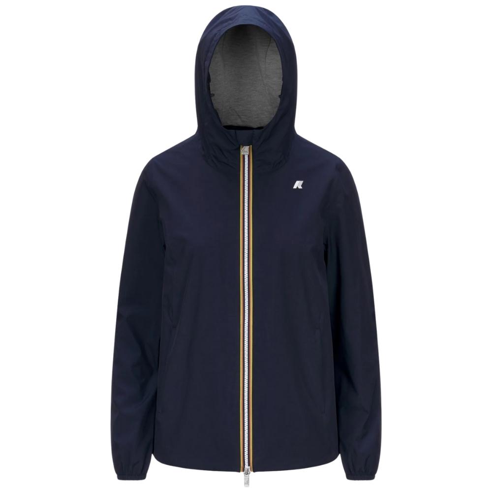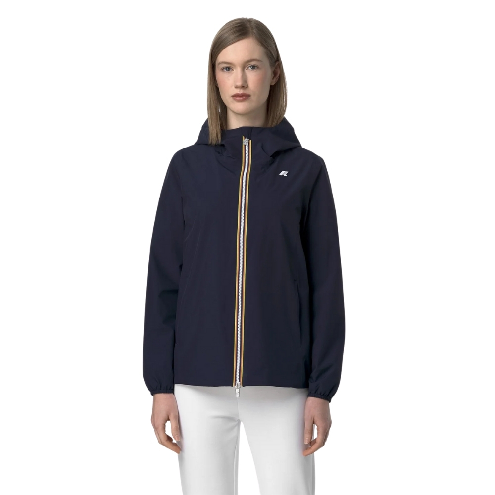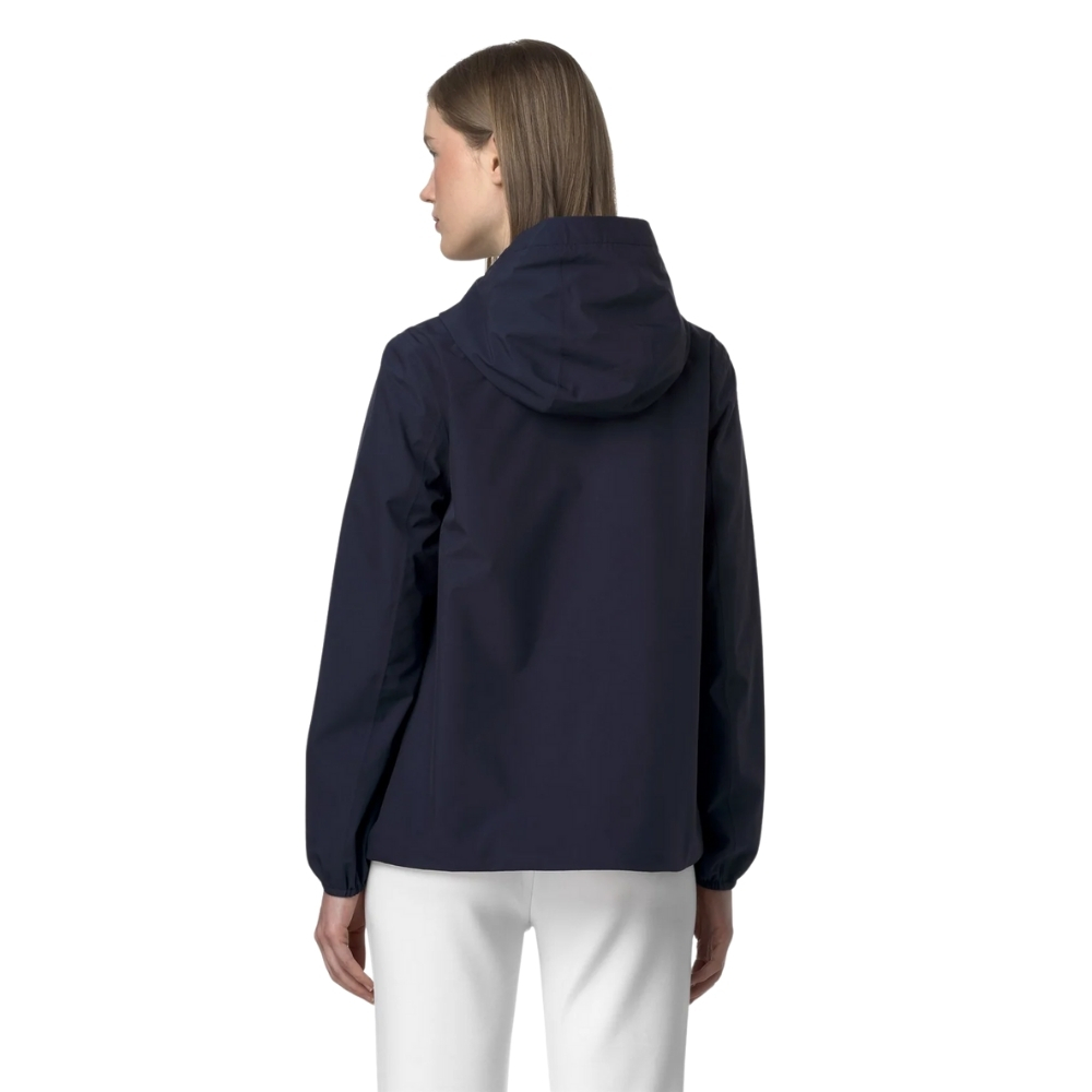 Marguerite è una giacca corta da donna che offre un grado di calore medio, ideale per la mezza stagione. Il modello ha un look casual e moderno, è realizzato in poliestere stretch con spalmatura impermeabile e antivento e ha una fodera interna in morbido jersey di cotone grigio melange. Le cuciture interne sono termonastrate e il punto vita è decorato con l’iconico tape multicolor K-Way per una nota distintiva e di carattere.