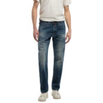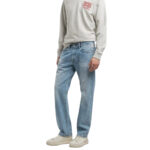 Pantalone in denim leggero lavaggio medio. Vita media con passanti. Due tasche all’americana sul fronte e due tasche a filetto sul retro con bottone logato. Chiusura con bottone logato e zip. Label Roy Roger’s applicata sul retro. Slim fit.