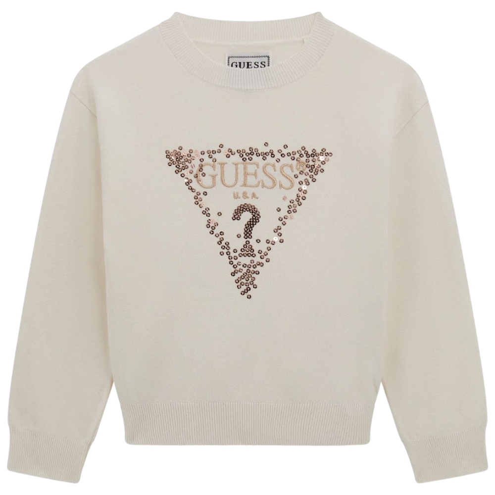 Logo frontale “GUESS” in paillettes: effetto glamour e visibilità del brand.