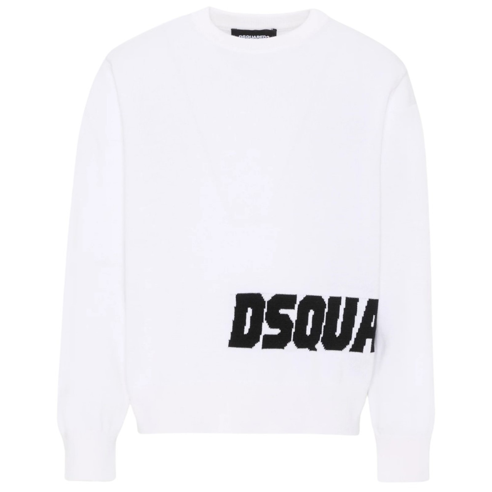 Maglione bianco realizzato in cotone, a maniche lunghe, con girocollo, polsini e orlo a costine. È decorato con logo nero sulla parte anteriore.
