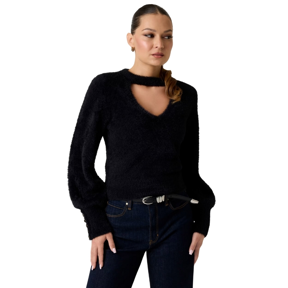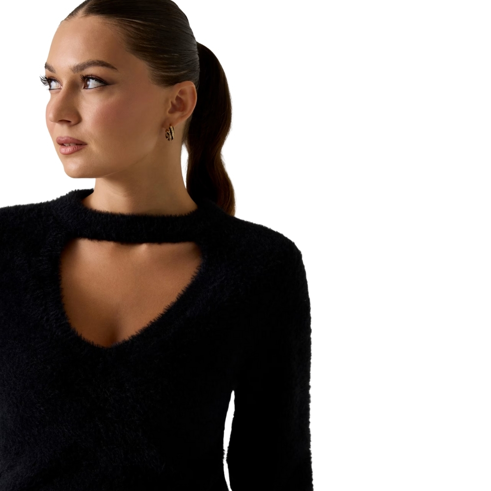Collo a lupetto, scollo a V e dettaglio cut out sul décolleté.