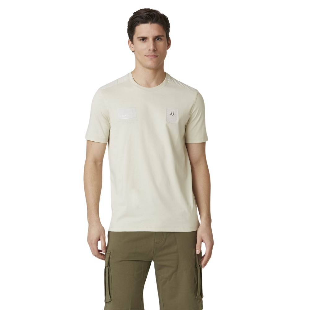 Confortevole e raffinata, questa maglietta a maniche corte per uomo in cotone unisce dettagli in nylon e patch termo-applicate in tono, che richiamano con stile le Frecce Tricolori. Ideale per un look sobrio ma distintivo.