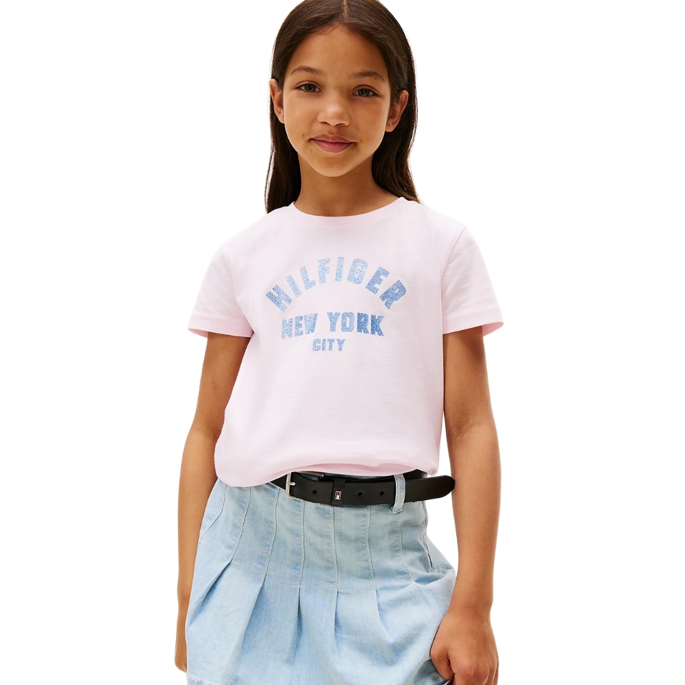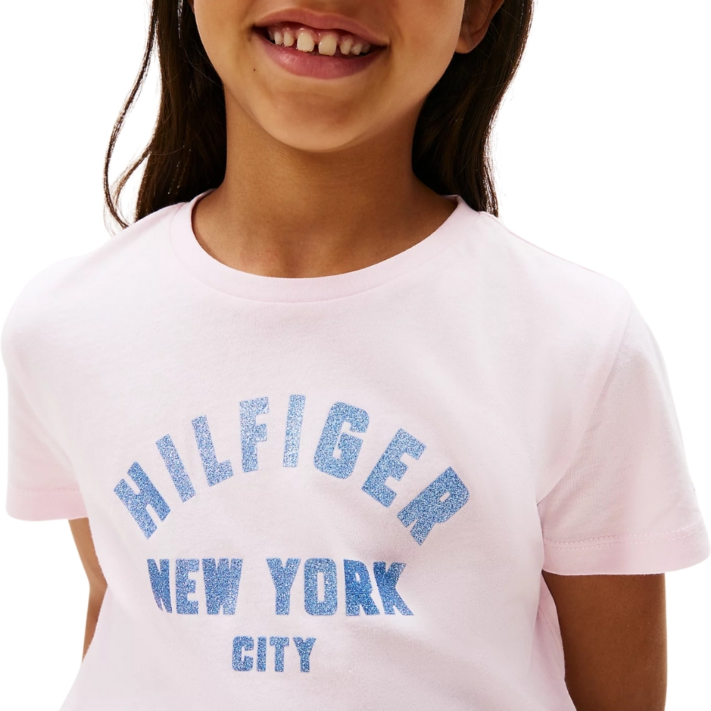 T-shirt Tommy Hilfiger junior con logo NYC curvo in glitter